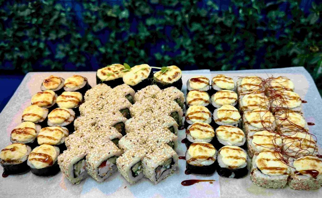- запеченные суши "Лосось": рис, нори, лосось, чесночный соус - 10 шт.
