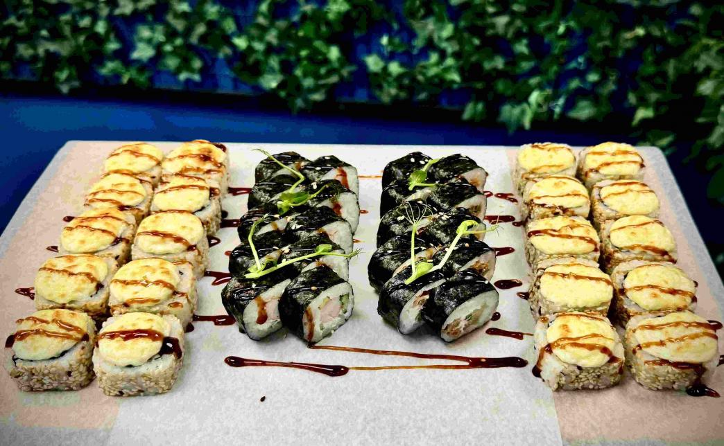 - запеченный "Маки цыпленок": рис, нори, сыр, цыпленок, огурец, моцарелла- 10 шт.