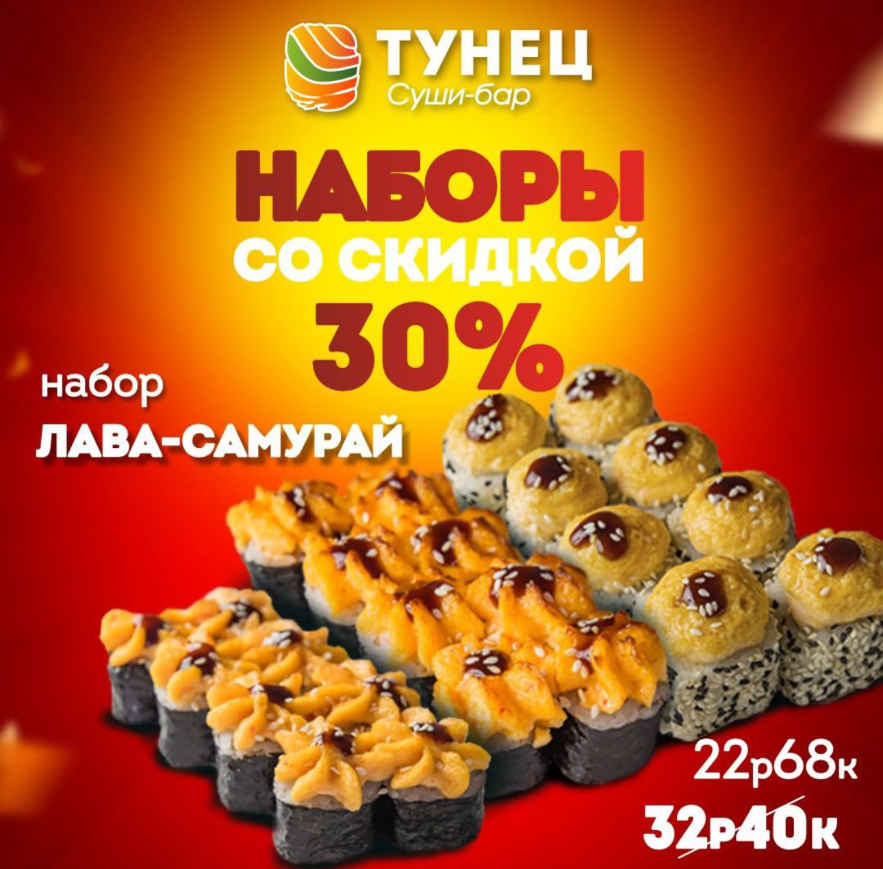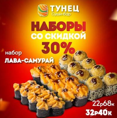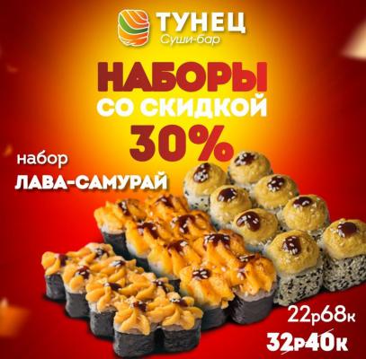 - Промокод дает право на скидку до 30% на суши-сеты, WOK от суши-бара "Тунец" в Пинске