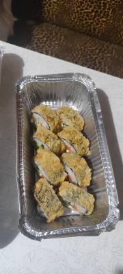 Состав: рис, нори, шампиньоны, куриное филе, сыр чеддер, сыр сливочный, лук фри, соус терияки, темпура