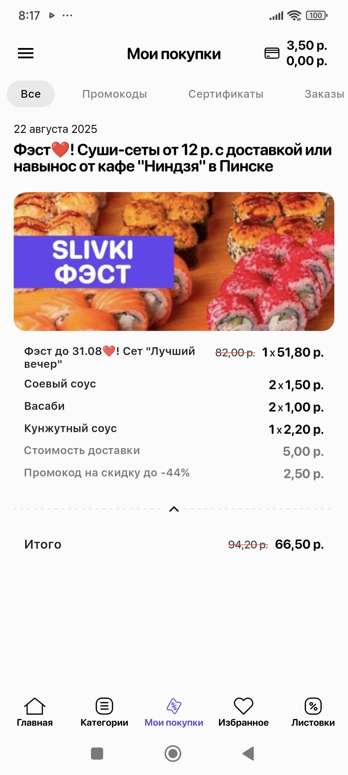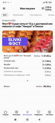 - Промокод дает право на скидку до 42% на суши-сеты от кафе "Ниндзя" в Пинске